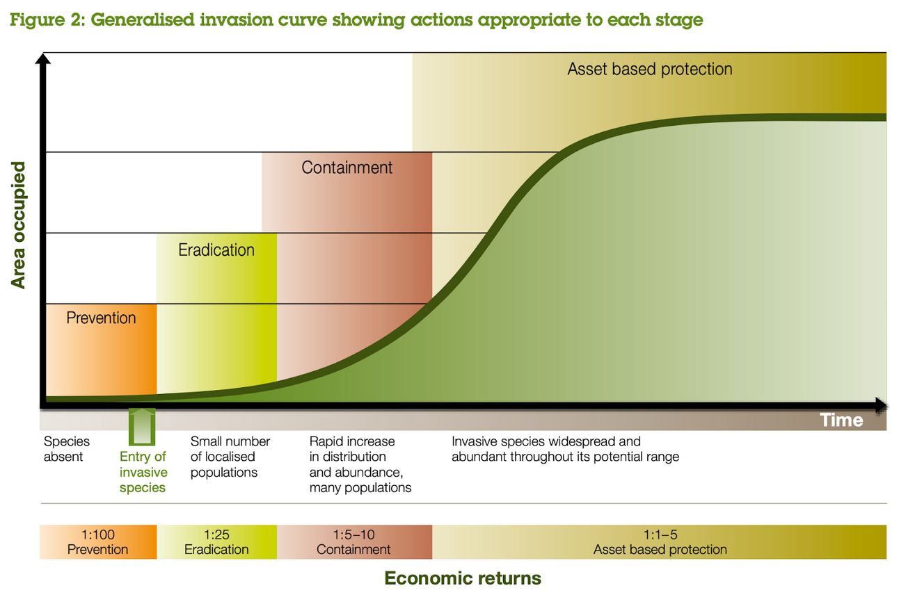 Containment: Once the species spreads beyond local populations and becomes more widespread, containment efforts aim to slow further expansion. The return on investment decreases at this stage.
