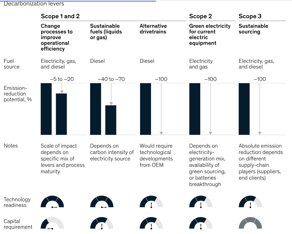 The challenge: Of the levers being pulled to decarbonise scope 1 and 2 emissions switching drive trains to Electric or Hydrogen is arguably the most challenging. Vehicles do exist but they are not yet available at scale and timelines for delivery of a full fleet are generally 2030+